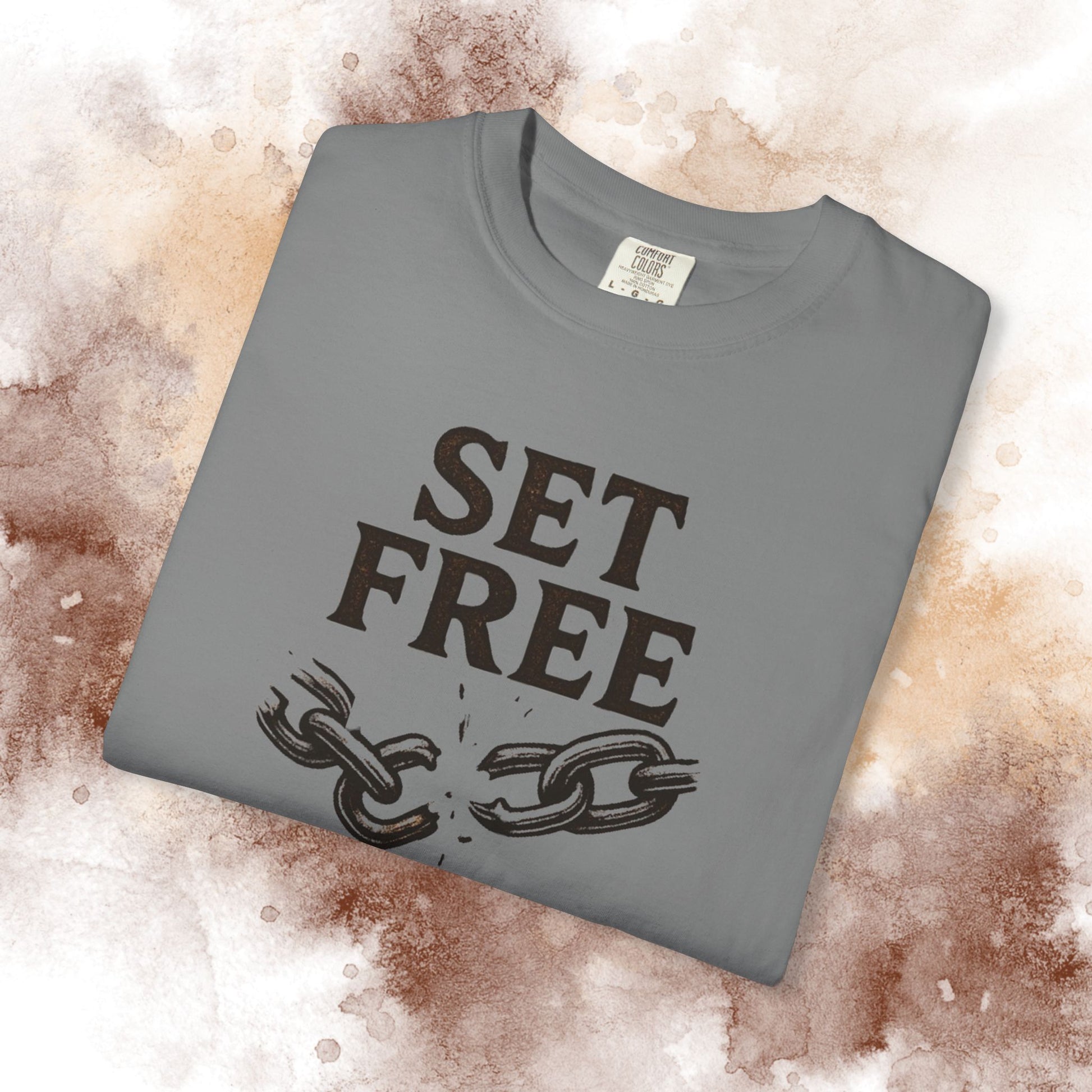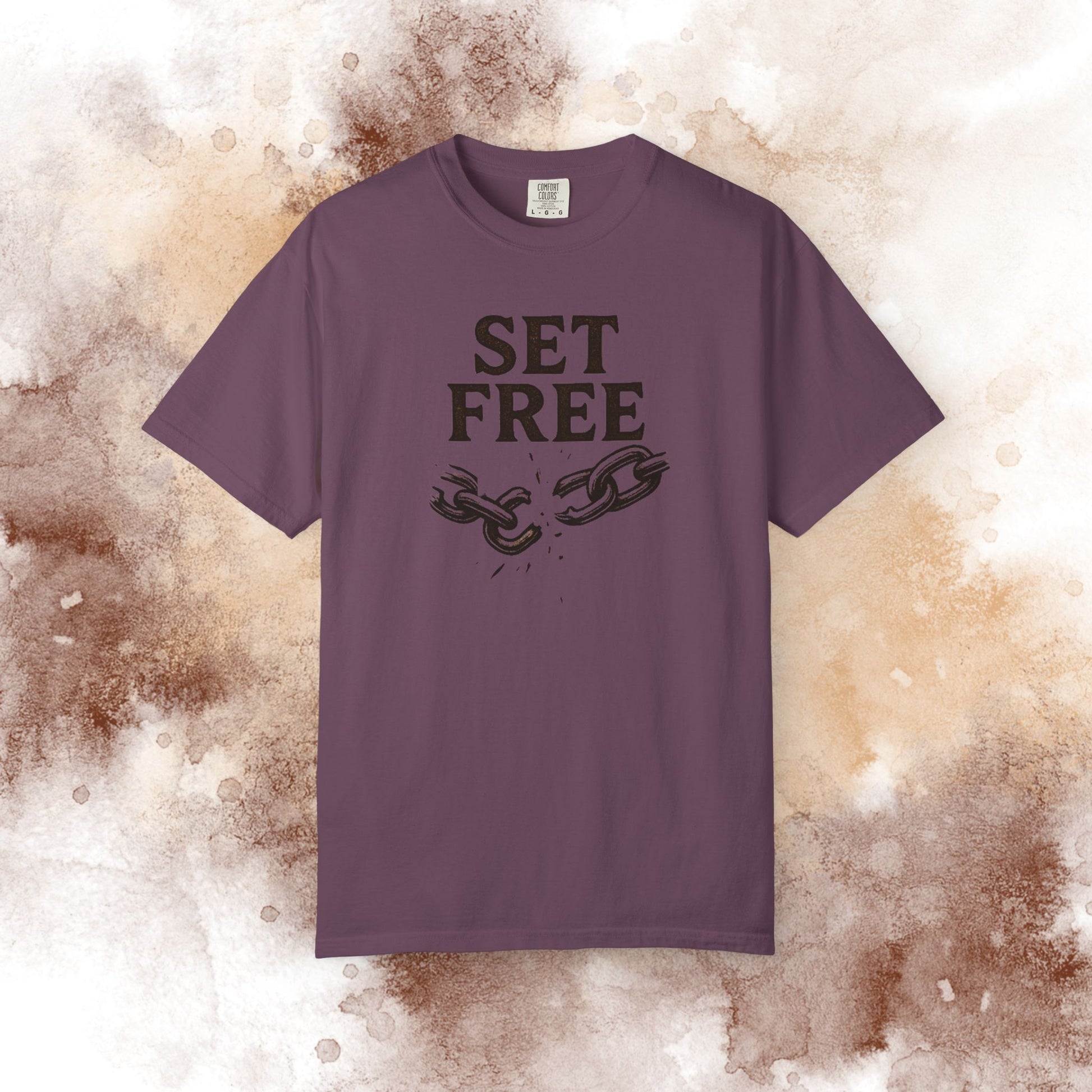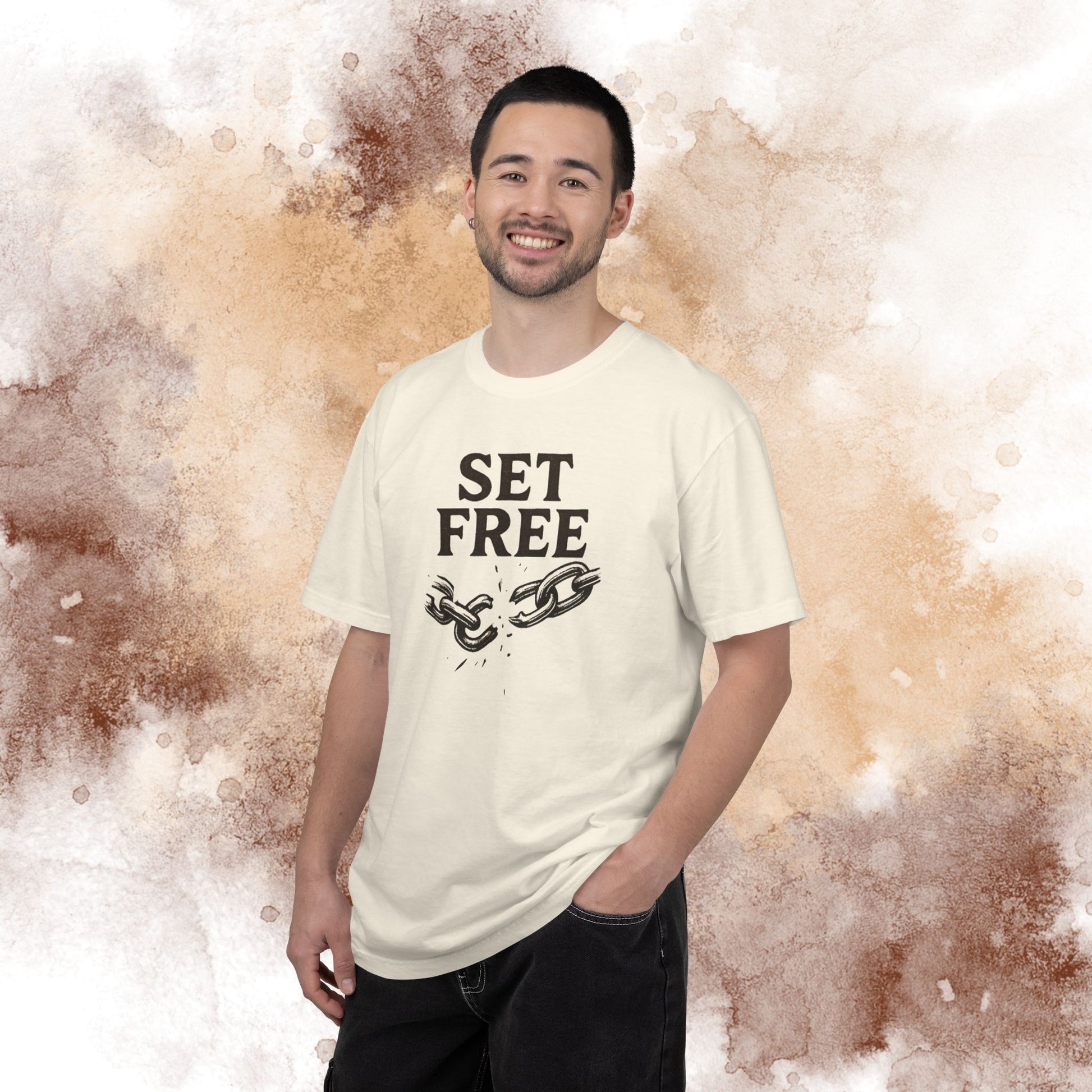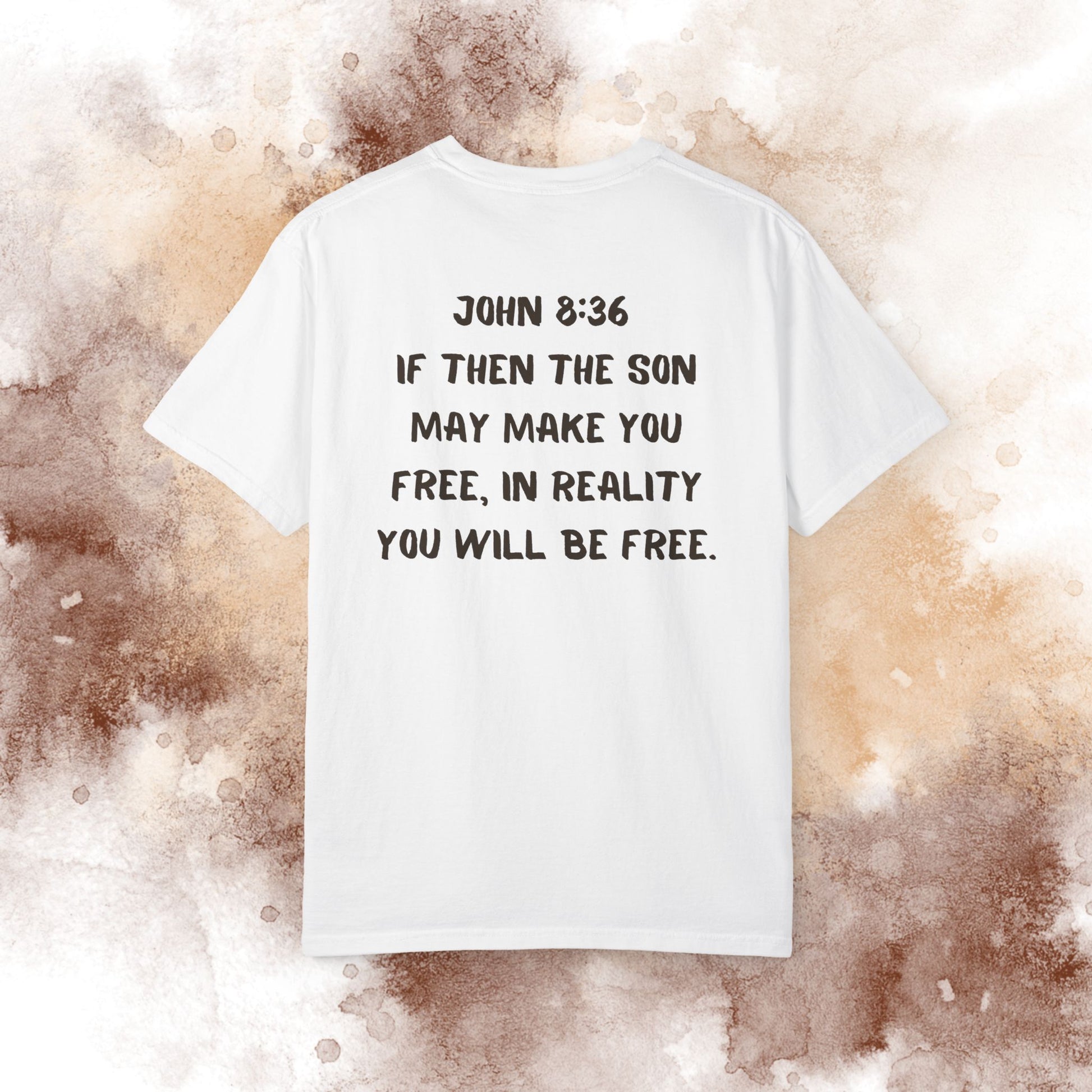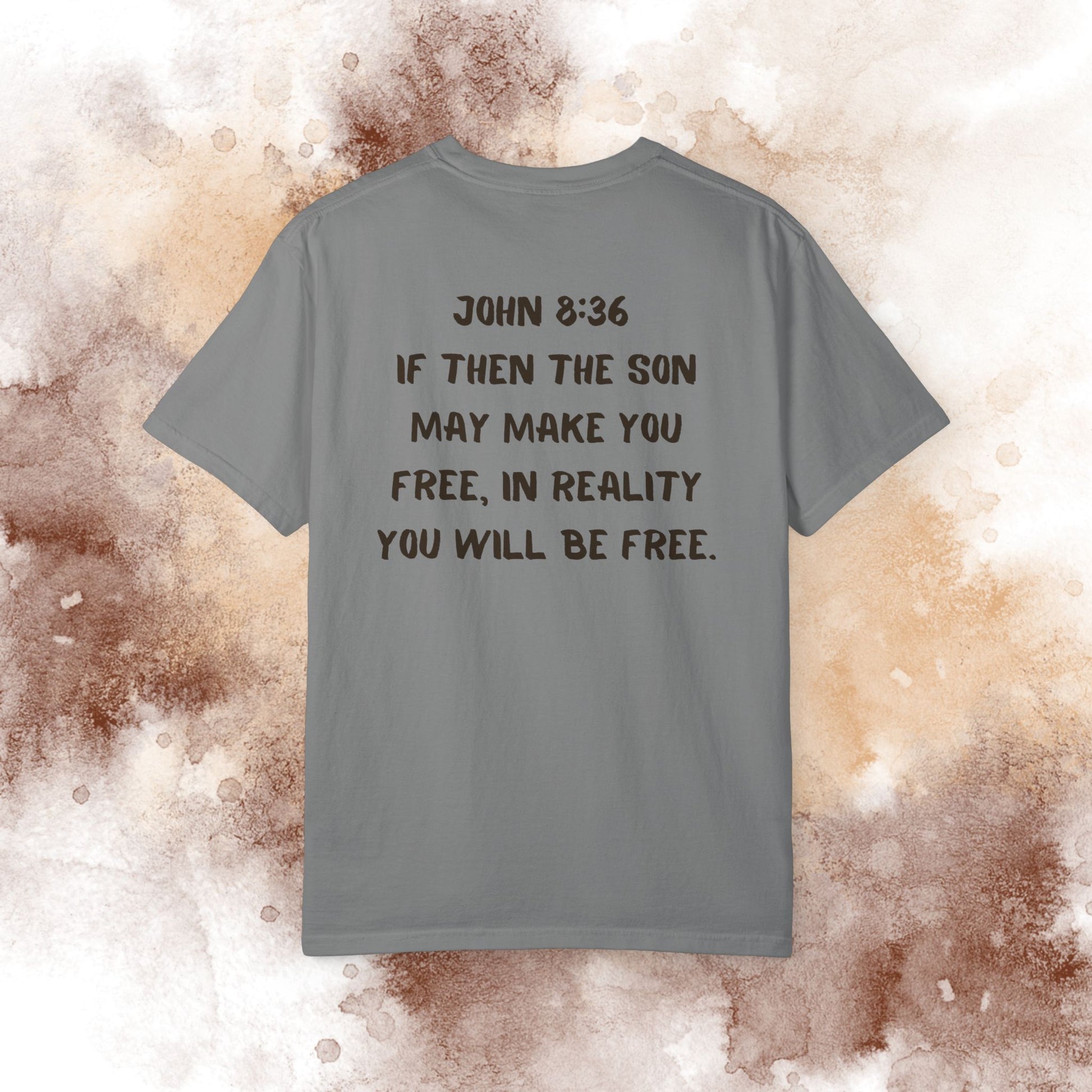 This heavyweight garment-dyed tee carries a quiet, courageous message — a broken chain illustration under the bold words “SET FREE” across the chest, and a reflective verse on the back (John 8:36). It feels lived-in from the first wear: soft, slightly faded color and a relaxed silhouette that sits comfortably whether you’re layered under a jacket or worn solo. The shirt’s texture and subtle vintage tone give the design room to speak — faith-forward, hopeful, and unapologetically authentic. Wear it to reflect conviction, to start conversations, or to hold close on days when you need a reminder of freedom renewed.
