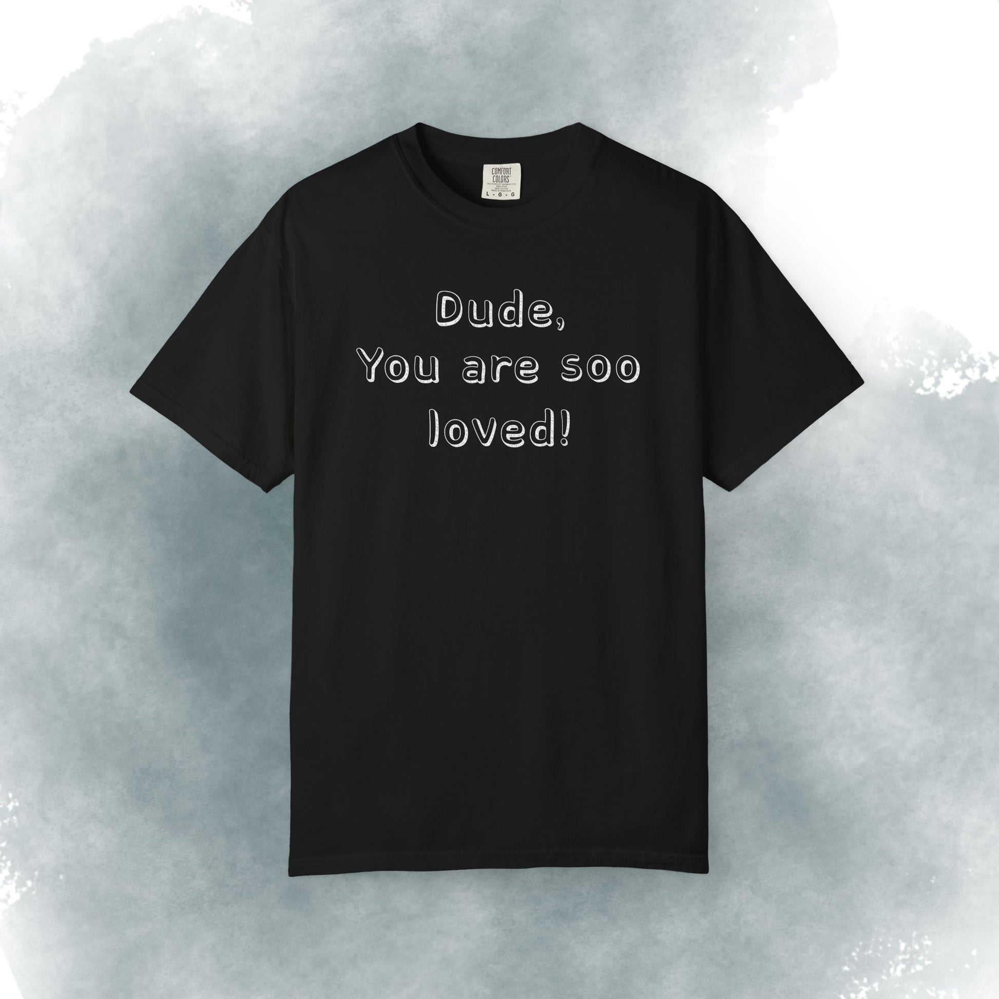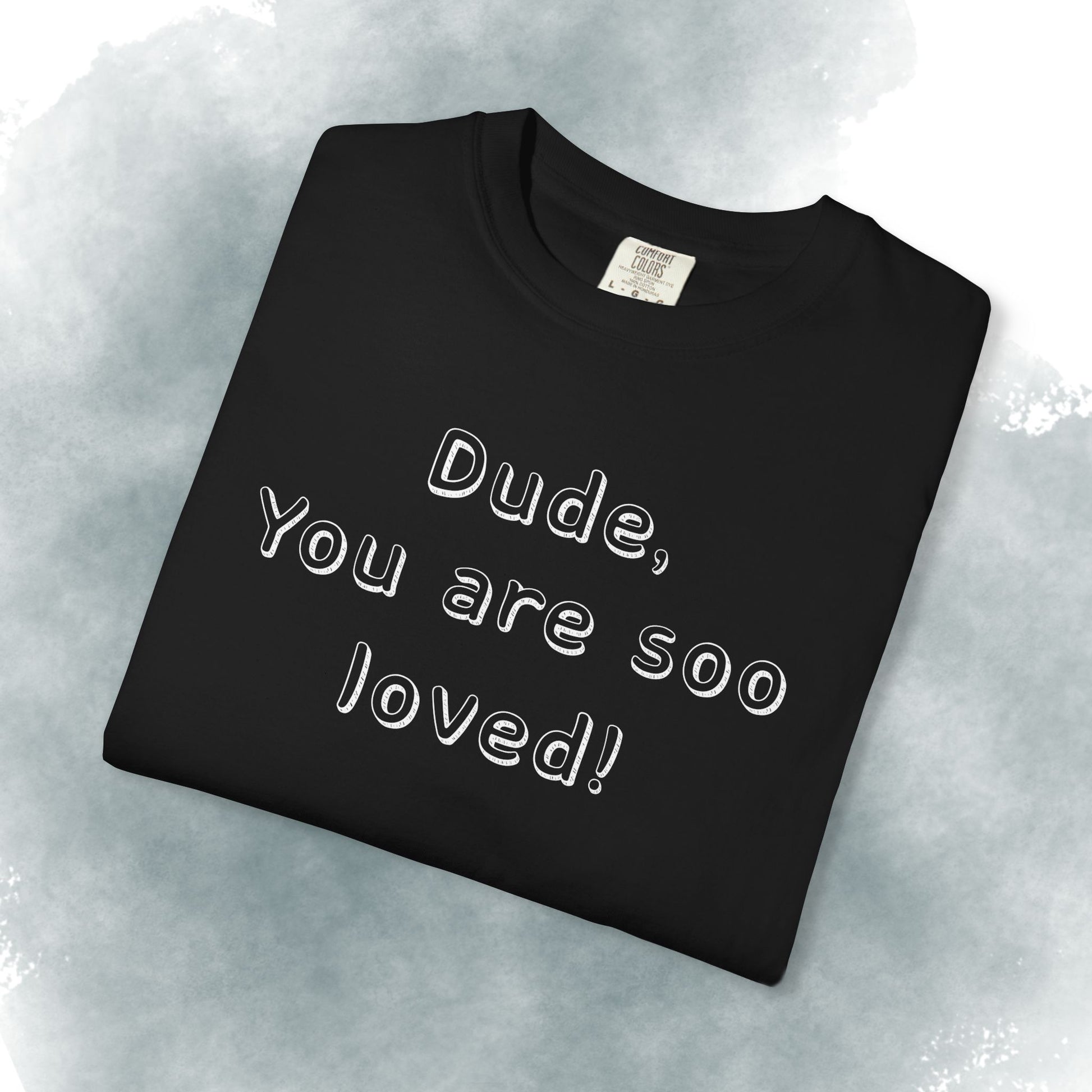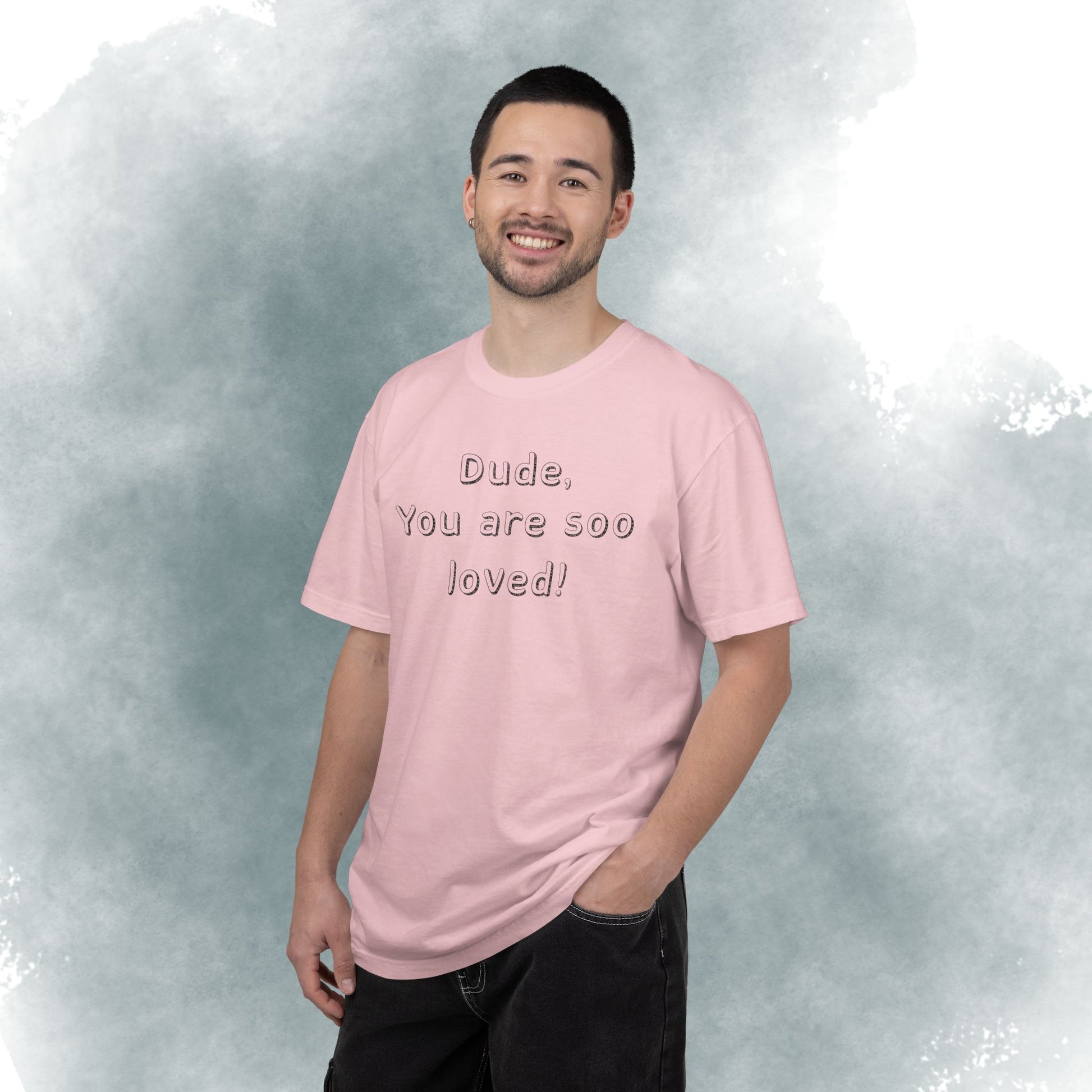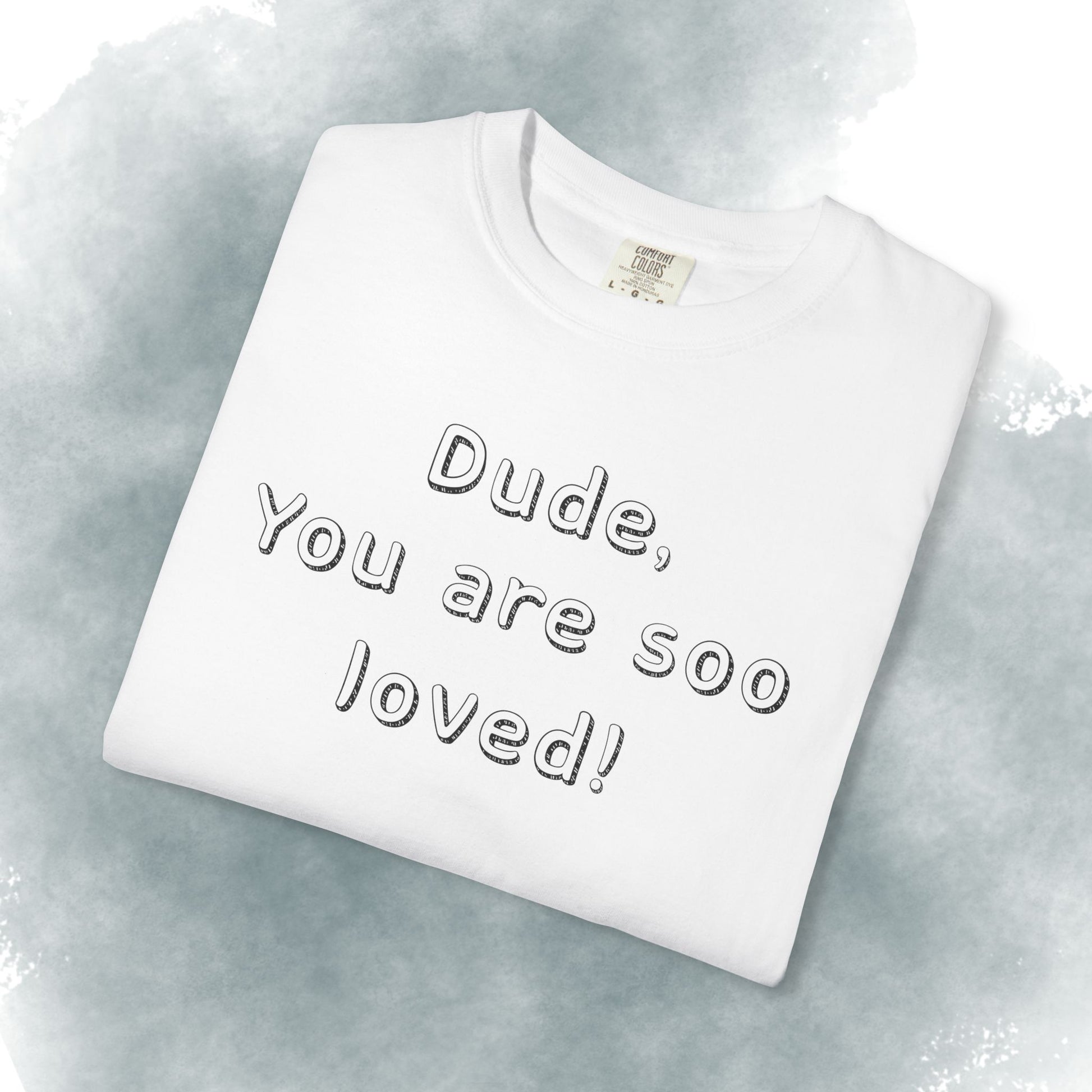 This heavyweight garment-dyed tee carries a gentle, intentional message — embossed text up front reading “Dude, You are soo loved!” with a short scripture passage printed on the back. The soft, lived-in hand of garment dyeing and the relaxed fit make it feel like a trusted go-to from the first wear. It sits comfortably in everyday life: layered under a flannel for morning coffee runs, thrown on after church gatherings, or worn while volunteering and hanging out with friends. The understated white canvas keeps the message sincere and approachable, while the durable construction means it stands up to repeated wear and washes without losing its shape or softness.
