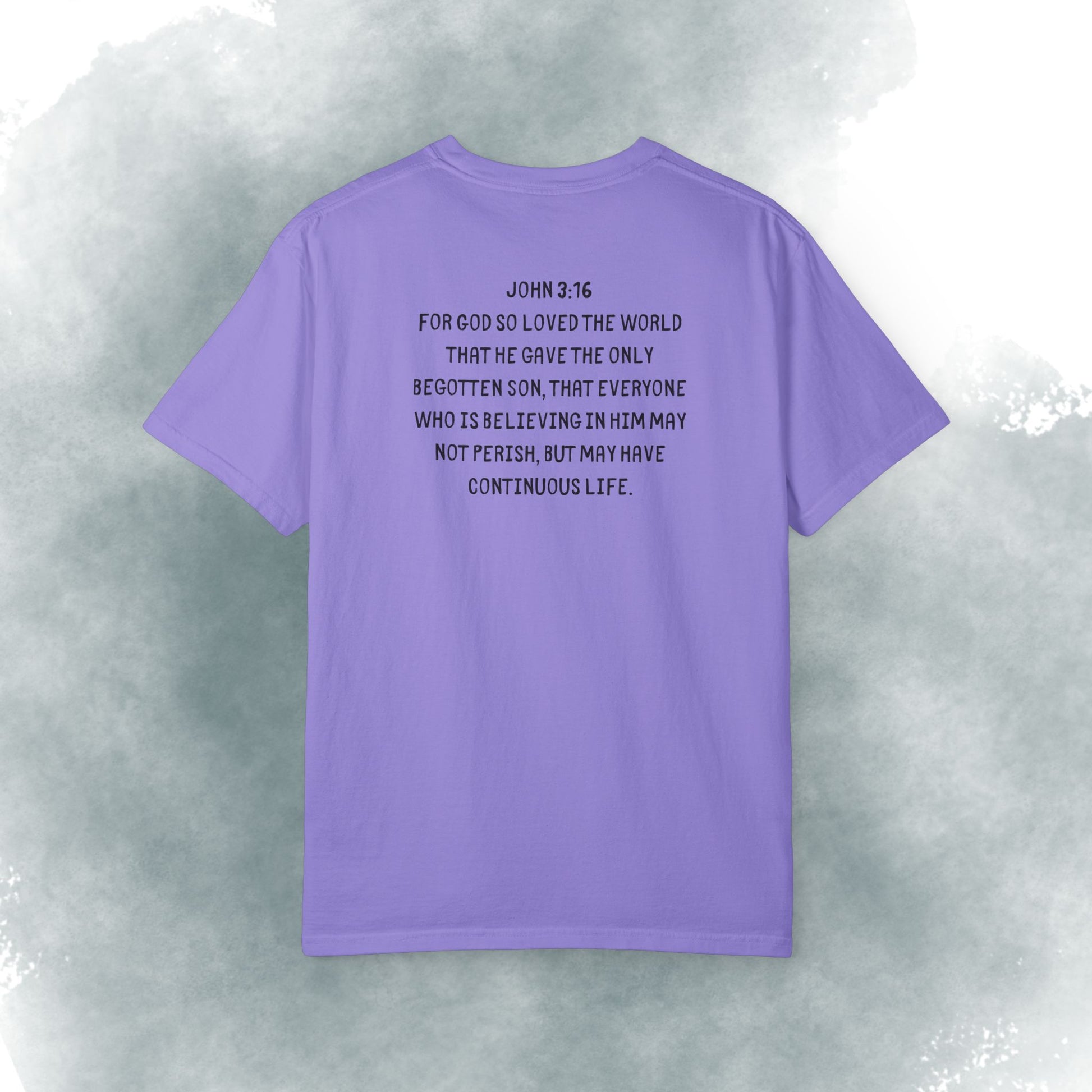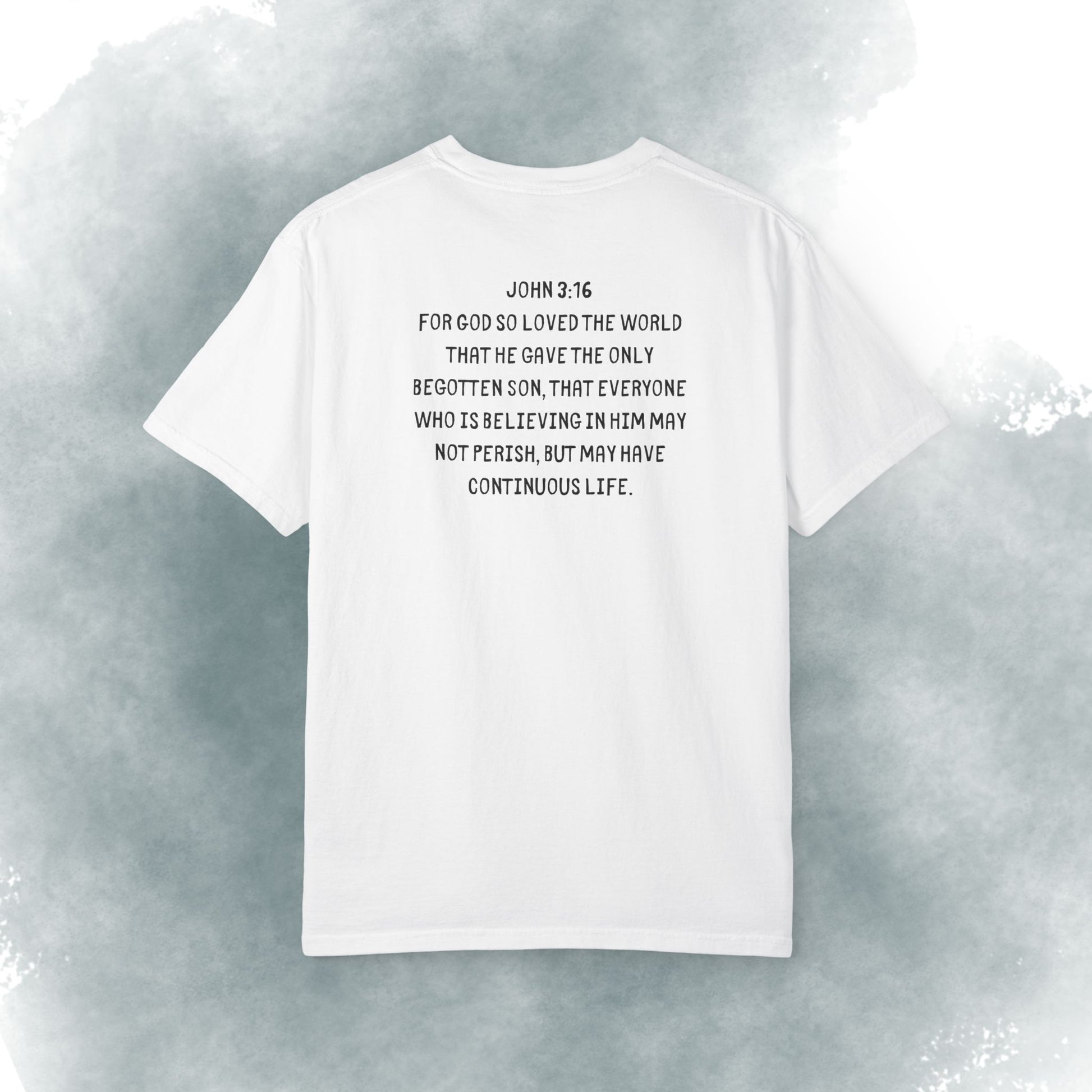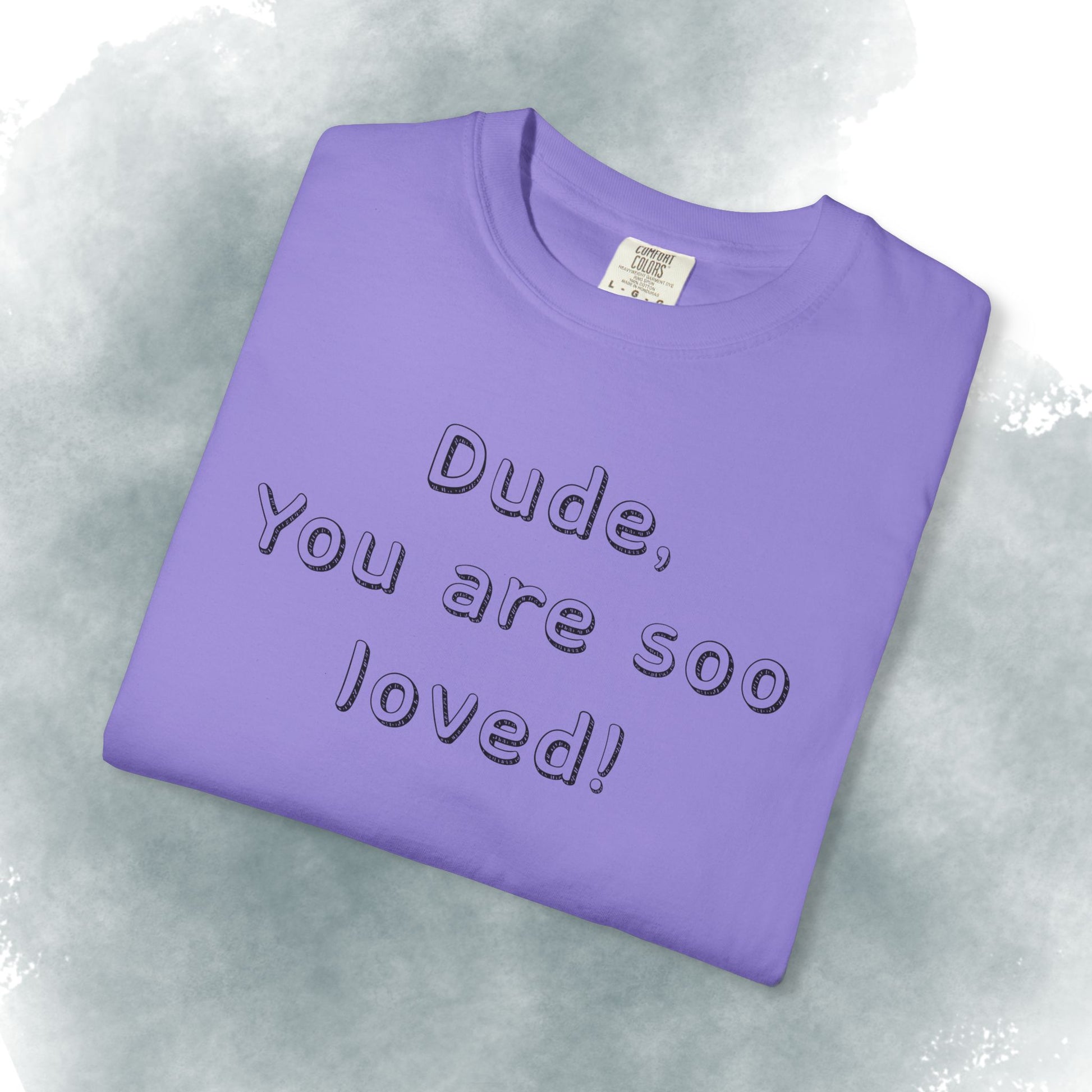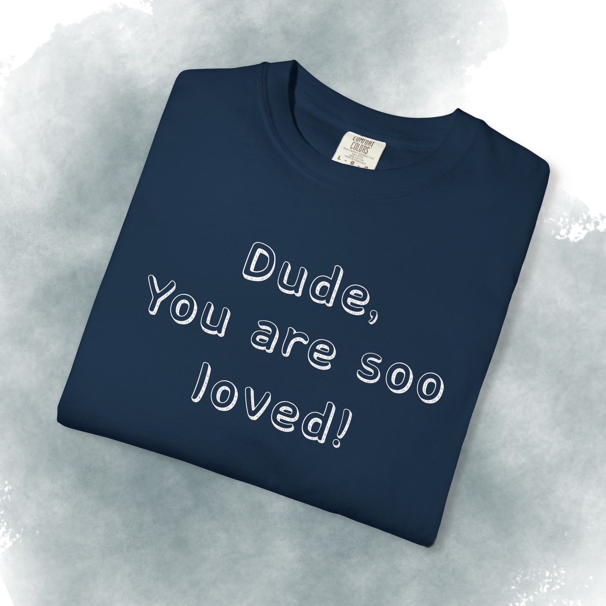 This heavyweight garment-dyed tee carries a gentle, intentional message — embossed text up front reading “Dude, You are soo loved!” with a short scripture passage printed on the back. The soft, lived-in hand of garment dyeing and the relaxed fit make it feel like a trusted go-to from the first wear. It sits comfortably in everyday life: layered under a flannel for morning coffee runs, thrown on after church gatherings, or worn while volunteering and hanging out with friends. The understated white canvas keeps the message sincere and approachable, while the durable construction means it stands up to repeated wear and washes without losing its shape or softness.